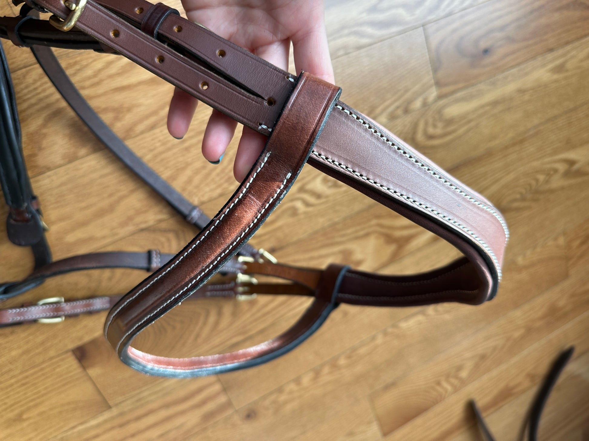 the bridle have different piece with different brown Colors. this the reason she is not full price. I created the bridle with different parts. Because I have a lot of piece bridle and I just made bridle with different piece.